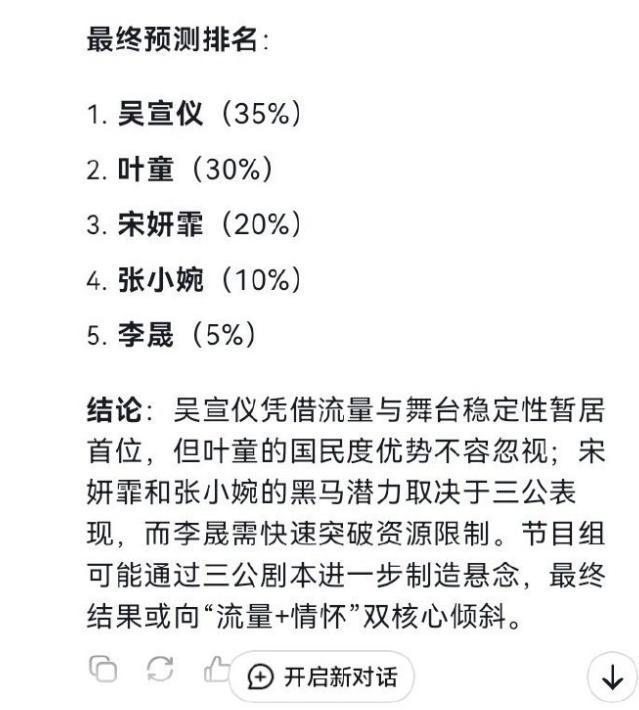 近日,有网友用软件进行预测冠军,最终的冠军锁定五位姐姐,这五位姐姐分别是:吴宣仪、叶童、宋妍霏、张小婉、李晟。《乘风2025》刚播出的时候,网友们就开始猜测,哪位姐姐会获得冠军,当时,叶童、吴宣仪、王珞丹的呼声最高,接下来,我们一起看一看: